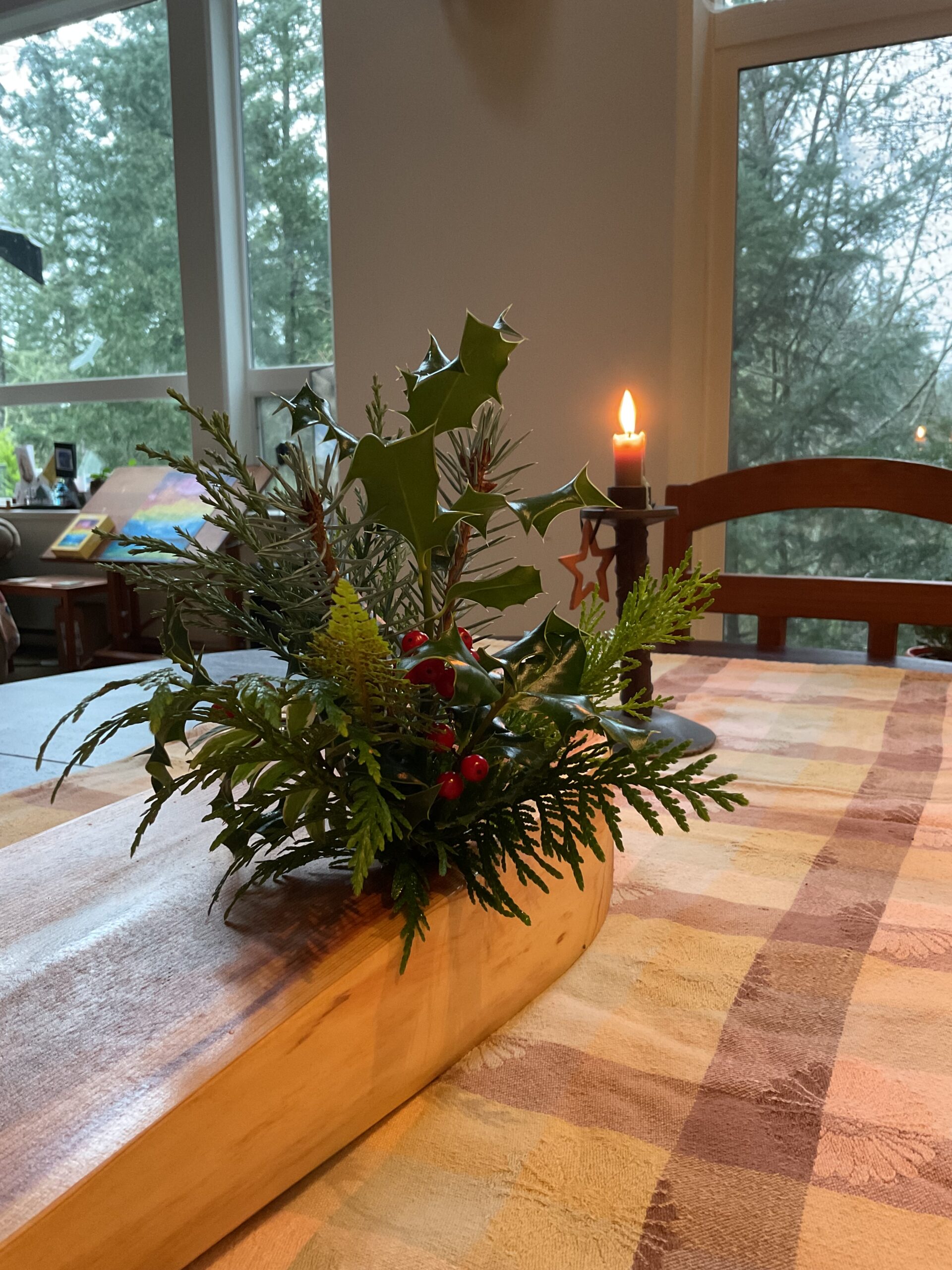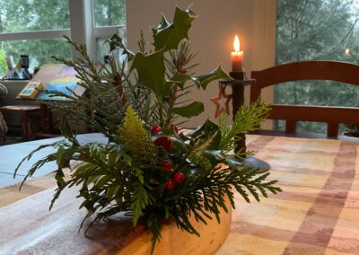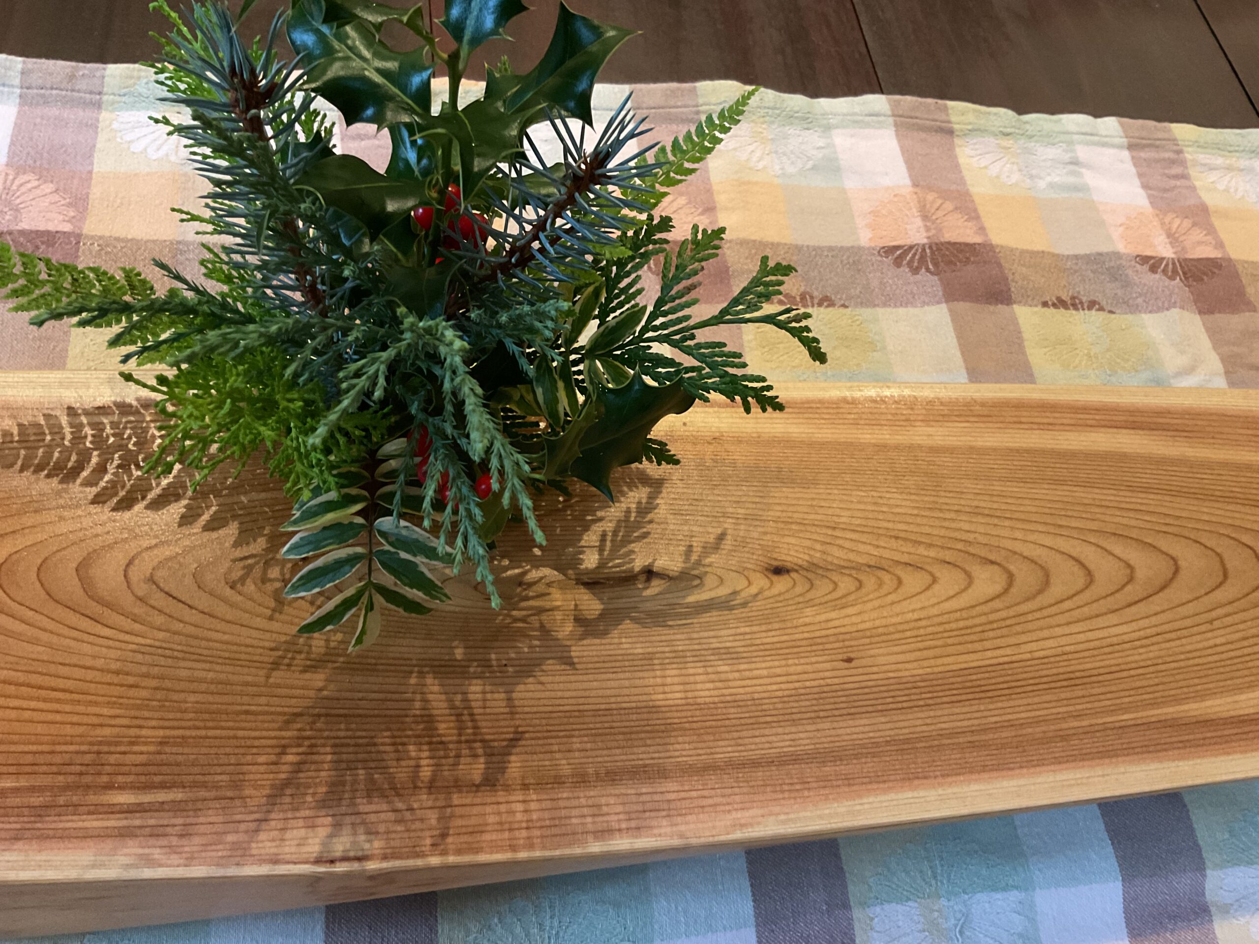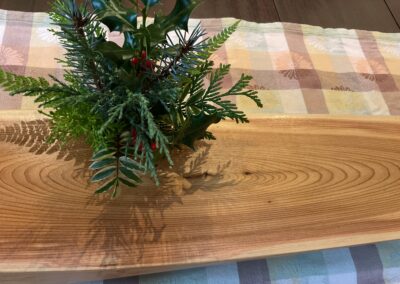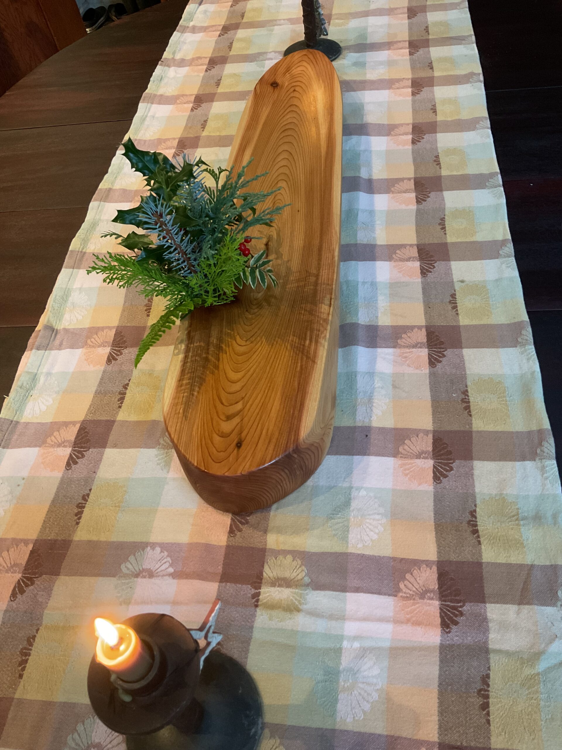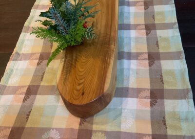 The grain pattern on this off cut of Western Red Cedar was reminiscent of celestial rings, and so it became the inspiration for this table centerpiece. The ‘black hole’ is fitted with a florist spike that allows for seasonal floral arrangements. Treated simply with Osmo oil to bring out the shades in the wood, this three foot long centerpiece can hold condiments for the feast or be left bare for guests to enjoy the beauty of the rings.
